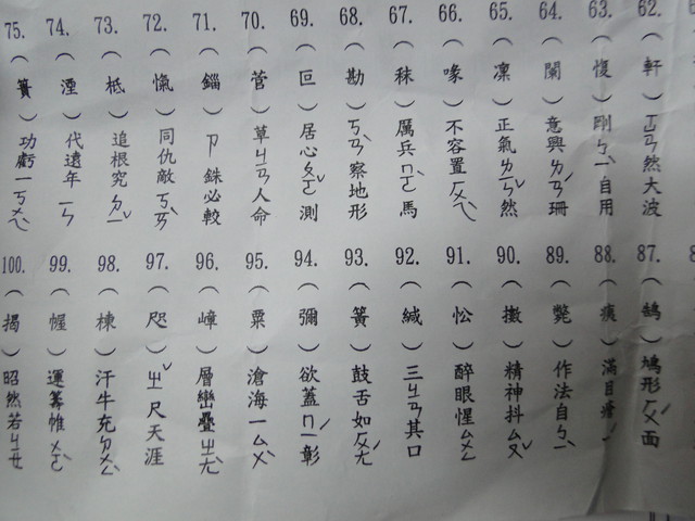 我一考卷,大有五位老能填完,其他的都把握住填完面。第一高分者高八十五分,位老真是我「天人」的然起敬不已。第二高分七十,能考六十分的只寥寥位,二十分、三十分者比比皆是。