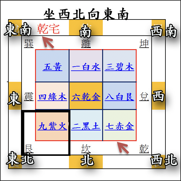 九紫到艮,九紫火中六白金,方也。八白(掉六白),主火,少丁,犯血症。作灶丁,木宜,井池水本方九紫火,主丁空乏,路不利。有高屋山水,主丙子戊子年尤不利。
