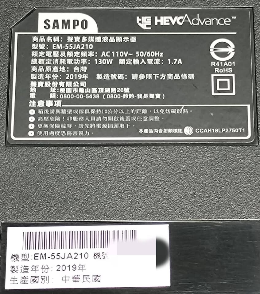 新天雷 55 4K UHD HDR 智慧 SAMPO EM-55JA210 LED液晶