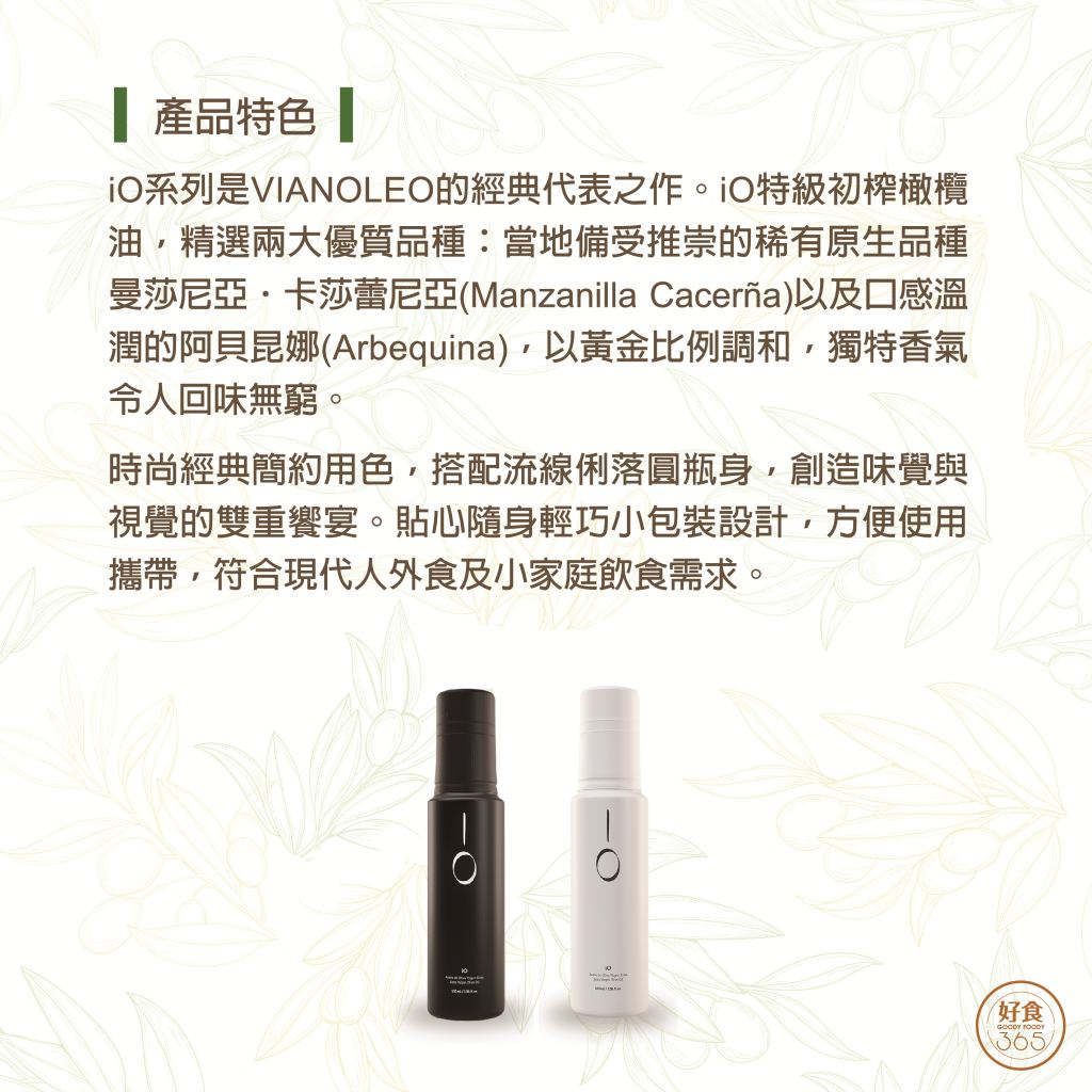 iO系列iO系列是VIANÓLEO的典代表之作。iO特初榨橄油,精大品:地受推崇的稀有原生品曼莎尼.卡莎蕾尼(Manzanilla Cacerña)
