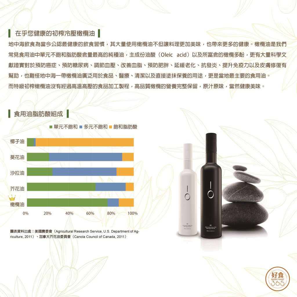 中餐味西餐美味 ● 料理新裸橄、美味超有感特清爽果香,口感和平,不味的貌最能托出食材的原汁原味。iO特初榨橄油(黑)是相相成之作,於「iO系列」的金合。