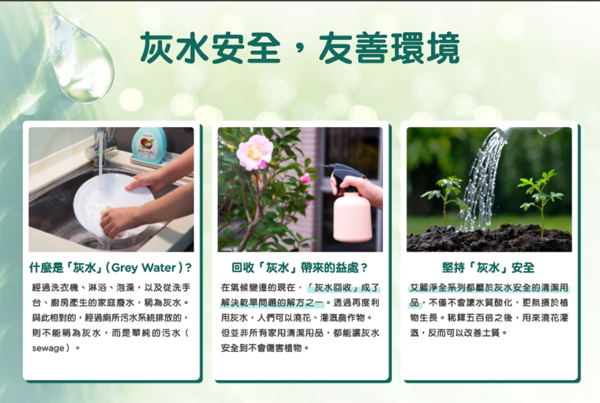水源越越珍,其2021才全台大缺水,由洗衣、淋浴、泡澡,以及洗手台、房生的家庭水,是可再利用的「灰水」,稀五百倍之後,可以用花灌溉,然源必自安全天然的生活洗,因此「灰水安全」成清依。