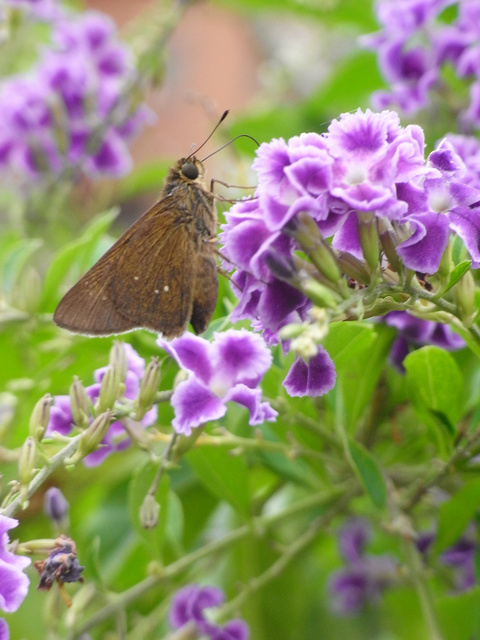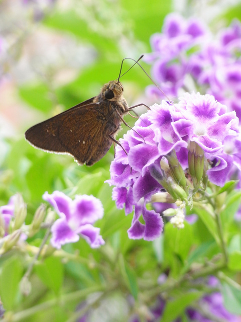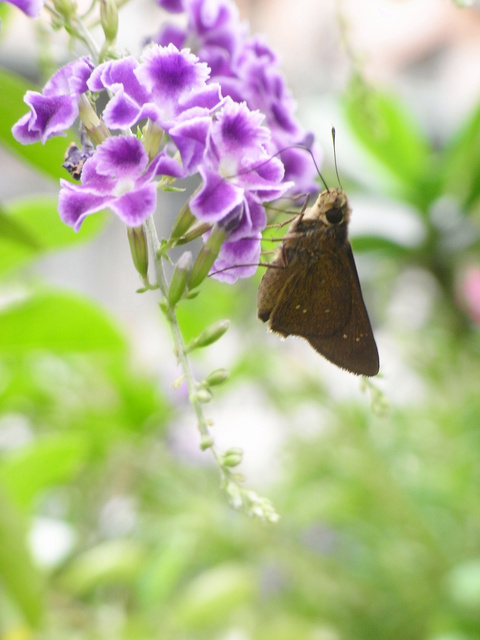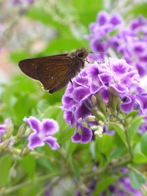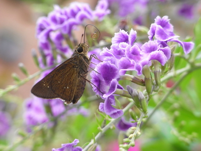 台弄蝶 (弄蝶科) 展翅20 - 34 mm,雄蝶翅膀表面黑褐色,前翅一列白色斑所成的弧,翅腹面褐色,下翅腹面有2-4枚白斑,其斑位置翅面相同。本分布於平地至低海拔山,幼以五芒、巴拉草等植物寄主,又禾弄蝶,成全年可,喜花吸蜜。 文字料取自:http://gaga.jes.mlc.edu.tw/new23/9308/w07.htm