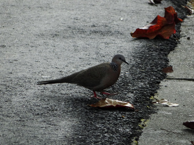 30cm,背灰褐色,下部紫褐色,部鼠灰色,部有一黑色底著白色珠斑的;幼,色灰色。一般耕地、都市公、地、行道常可三、五成群在草地上食以、草籽食或在空地上空行,行中整感般子不同,型瘦、尾羽,速度快可分辨之。行中停梢或上尾羽成扇形,外白斑清晰明,唱一般家相似。