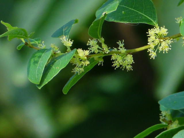 花: 淡色小花,直 0.2~0.25 公分,成稠密腋生的花,花梗短;萼形或矩形;花瓣;雄蕊 5 ,突出;子房卵形,花柱 3 枚。初夏花,雌雄株,雄花常多簇生,花被 5 片,雌蕊 5 枚;雌花少, 3~5 朵簇生,花柱 3 枚。