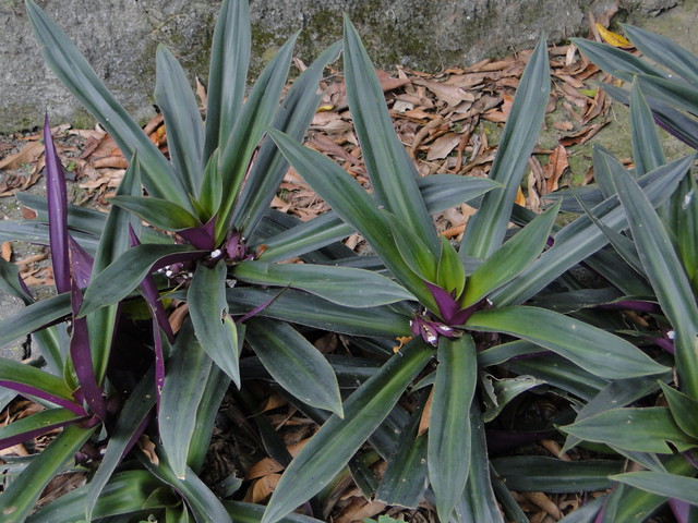 : 互生,密集,片多肉,披形, 20~50 公分, 3~7 公分,基部鞘,抱,先端尖,全,上面深色,背面紫色呈形,先端尖,面暗,背暗紫色;面有毛,厚而脆,易折。