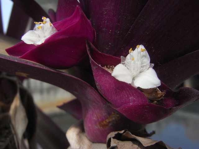 花: 花腋生,具短柄,多聚生,包藏於蚌苞片,每蚌苞被可出十朵小花,大形紫色, 3~4 公分,萼片 3 枚,披形,分,花瓣;花瓣 3 枚,白色,倒卵形,分;雄蕊 6 枚,花白色,被毛;子房柄,3 室,室有枚胚珠。夏季花。