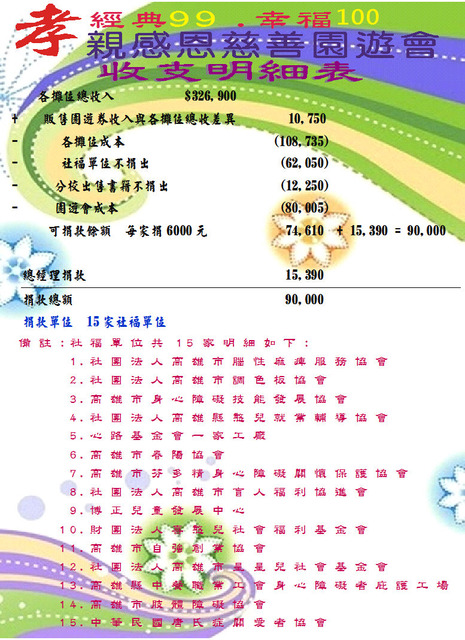 宏典99幸福100收支明表已算完成~★附上收支明表之海 (含完整的成本,支出及捐款)★捐款位 共有15家社福位 (明如下)★本次落幕,特感15家 社福位的共襄盛!