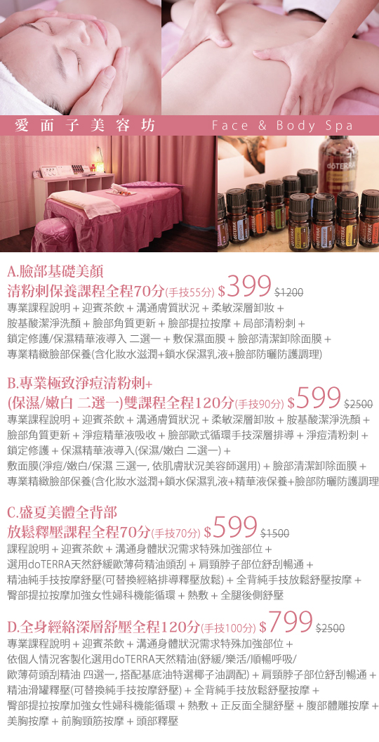 只要399元起,即可享有【面子美容坊】A.部基美清粉刺保程全程70分(手技55分) / B.致痘清粉刺+(保/嫩白 二一)程全程120分(手技90分) / C.盛夏美全背部放程全程70分(手技70分) / D.全身深舒全程120分(手技100分)↓↓↓限量特惠的惠按↓↓↓