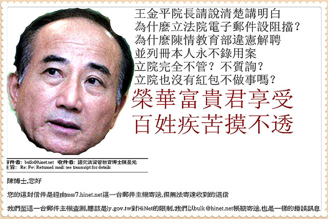 :立法院教育部及行政院人事有立澎湖科技大以「打官司」、「寄子件」解「行不」,以造的「卷查表教量分低」解「教不力」,解聘教育部要求列永不用昱元老,主持公道,依法行政,我工作及人格,查照。