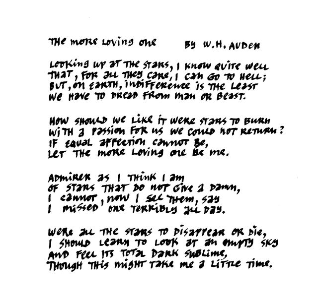 最近在茉莉店到一本抽象表家茵哈特(Ad Reinhart)的文集: “Art as Art”。打者序言,第一赫然出一首茵哈特手抄的稿,看是登的“The more loving one”。首茵哈特有特殊的意,尤其其中到天空全然黑暗的崇高,茵哈特的黑色,有曲同工之。且按下不表。