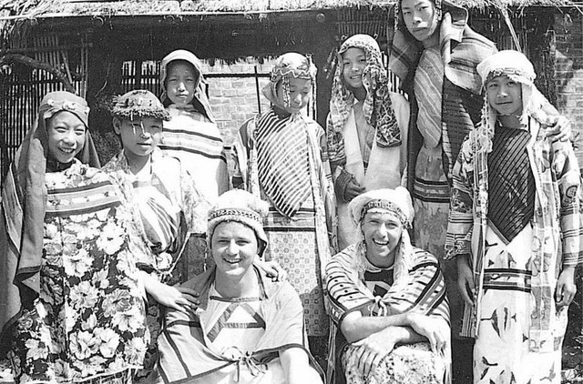 1967年夏令在日月潭行,心地穿著原住民服在「毛家花」合影留念合影留念。