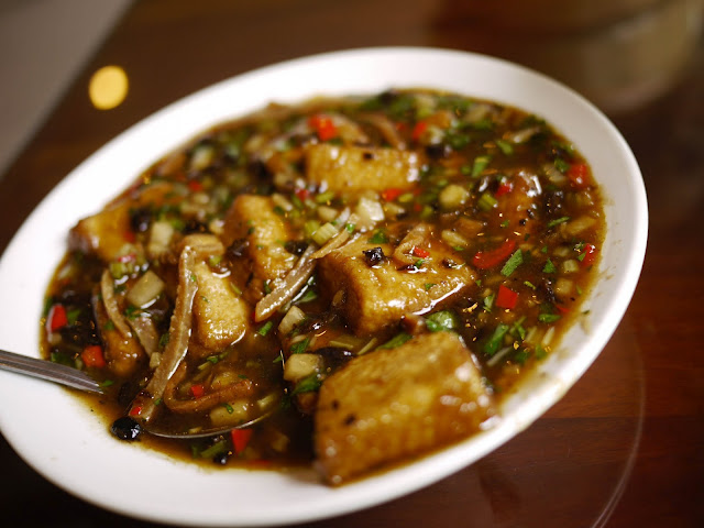 坡豆腐,一上桌最引人注意的是色黑、上浮著剁碎辣椒及香菜的汁。香十足,色醒目,一口豆腐入味幼嫩,原本心相辣的汁其具配色效果,但仍是合下,容易一不心就多吃一碗的菜色,合吃重口味的客人。