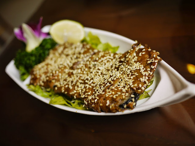 蒲素,看起心目的一道日式菜色。以花及生菜底,放著看起相可口的素。所的素其就是海苔包著豆皮煎,再上炒香的白芝麻即可。而份蒲多了些工夫,除了有酥脆的外皮及柔的外,能到甜如糖蜜的味道,但吃有些太甜,所以就要淋上餐附上的新檬汁—得手檬片用力。如此一,就能同到酸甜味的素,如果再配一些下的生菜味道更佳。
