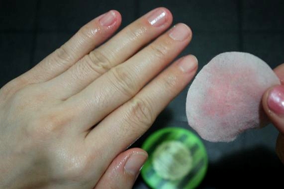 《Nicka K 妮卡》卸甲棉片使用後呈柔和的淡粉色(似手上的指甲油色),且有油滑指甲,棉片用擦拭手後足有。