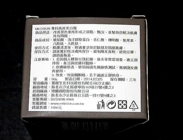 【MILDSKIN 科高度美白霜】 MildSkin 保系列 ,由美容理程後肌所的修保品。包盒上有品介使用方法。包盒白的罐子,耐高的五回收材,有助降低容易的情。盒,瓶口附有吸附的隔拉片,使用以後可以重回瓶口,多了防。美白霜~柔白的色,淡雅清甜的香香好味,不怎流或流慢的地。面含有的成分~助改善黑色素所形成的斑黯沈。抹,美白霜的地很柔滑,於肌的感很舒服,可以稍加按摩促吸收。抹~可到散出的甜淡舒香味,味道好心情有感舒放!肌吸收以後~舒服的,有、白,不油或油油亮亮的。※※ 使用心得供考,感受因人而。