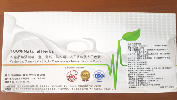 包盒整色彩案素素、乾、白,盒面示醒目的'慌唐袋'品名及青色的糖草.糖草又地草,100%天然草本植物.