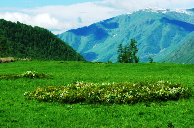 山峰雪未化,草地上的野花先到春夏的息,了笑。