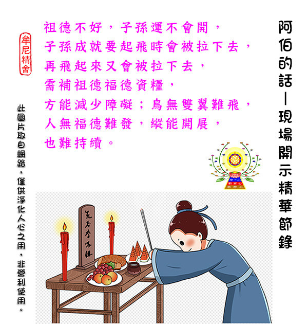 然人常期待祖先的庇佑,但不是每祖先都有能力留、留房、留金子,您也不能只心有有可拿,因更重要的是祖德。《阿伯的—示精》:「父母的德行即是子女、子後代的祖德,好好修、好好,除了自己修行精,功不唐捐之外,也能福子後代。」祖德的好,直接影家族的旺和後代子的,不可不慎。