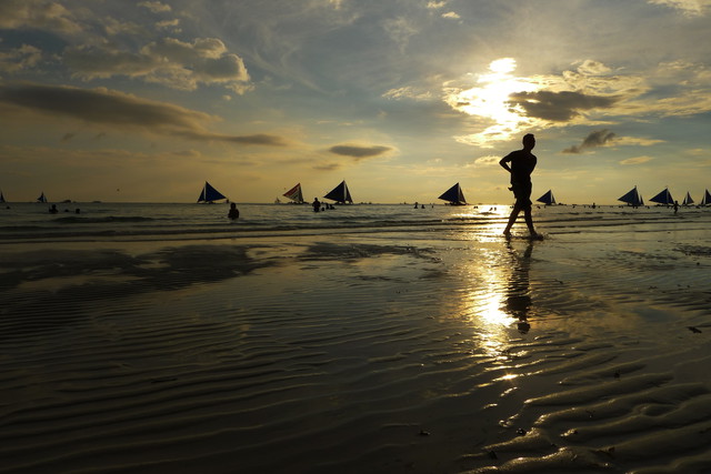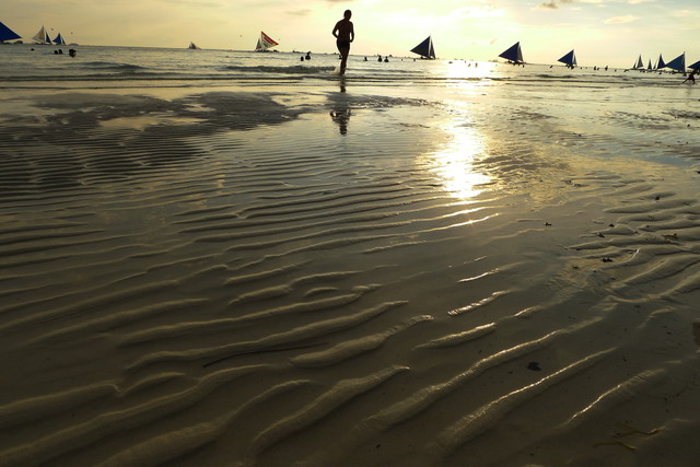 夕倒影映在海上,折射在沙上,光影醉人。上下幅金光暮色下沙上背光的人物剪影,面是不是有意境阿!