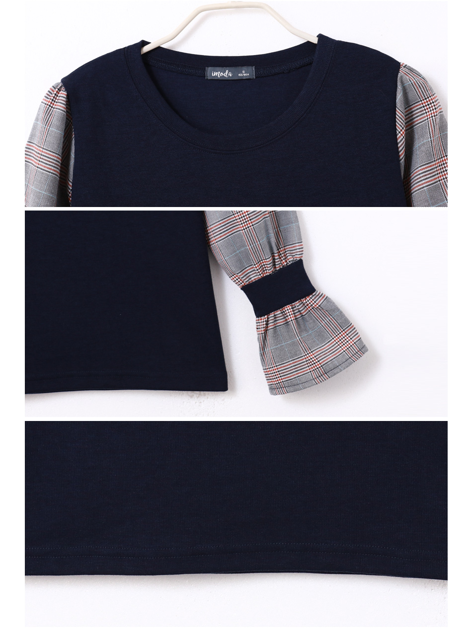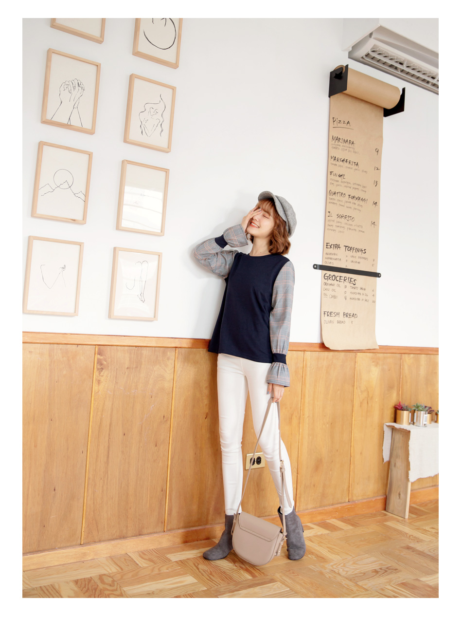 英式拼接格喇叭袖上衣