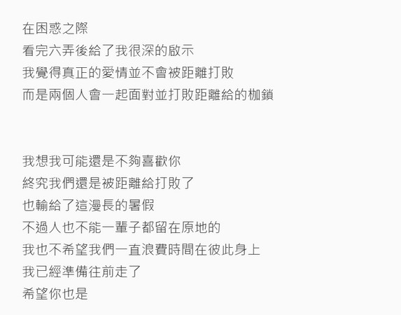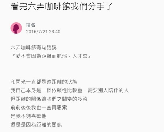 原po表示:「和光一直都是距的,我自己本身是一依性比重,需要人陪伴的人,但距的我之的冷淡,前前後後我也一直在思索,是我不喜他,是是因距的。」果看完《六弄》信自己跟男友的是被距打,所以提分手。