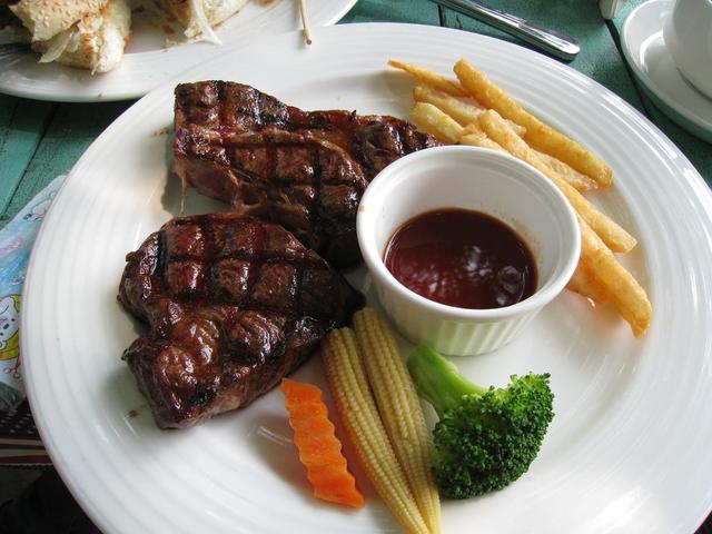 坐在外吃牛排和大堡也是第一次 , 旁有一小公 , 小朋友也玩得特心 !!