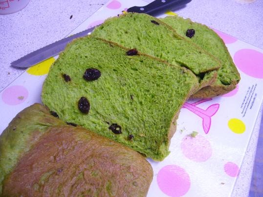 高粉220g低粉30g抹茶粉7g奶油25g砂 大*1.5奶粉 大*1 → 器所附量匙 小*1 奶180ml……→以上全放入拌缸酵母粉 小*1…→放入酵母自投入孔:酵母功能:吐司……所需大4H葡萄乾:有……量,太多影吐司烘烤效果烤色:淡色▲原本要加小豆,但都找不到,好到有大葡萄乾在土司配方中的糖都量,有奶油也搭葡萄籽油,清爽。今天成品就吃使用抹,吐司不甜但搭稍甜的大葡萄乾,口感不,淡淡的抹茶香我考下次抹茶粉量。