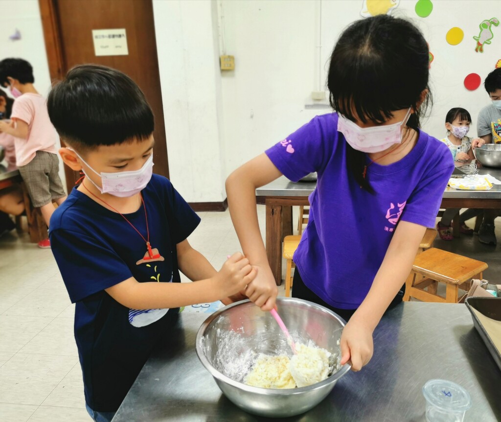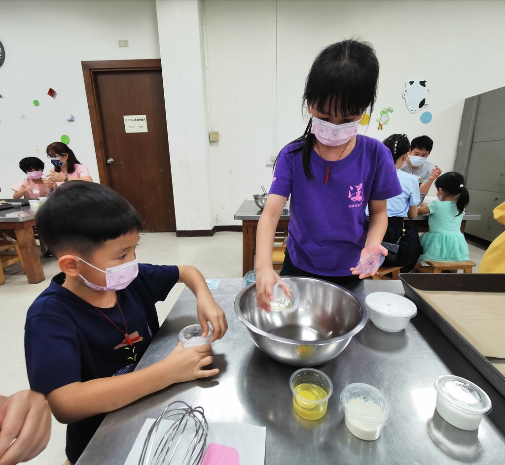 一次要DIY的乾是「啵啵星球」,在每座位上,工作人先作乾所需的器具及食材,食材部分有低筋粉、奶粉、牛奶、蛋液、葵花油、砂糖、葡萄乾等,天,姊弟一起DIY乾,在教室前方,有人教如何作,同也有工作人在旁走助。