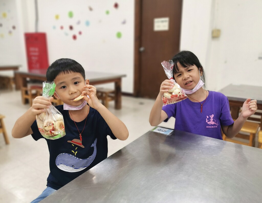 趁著等候乾在烤箱烘焙的候,姊弟是教室後面的彩壁拍照。