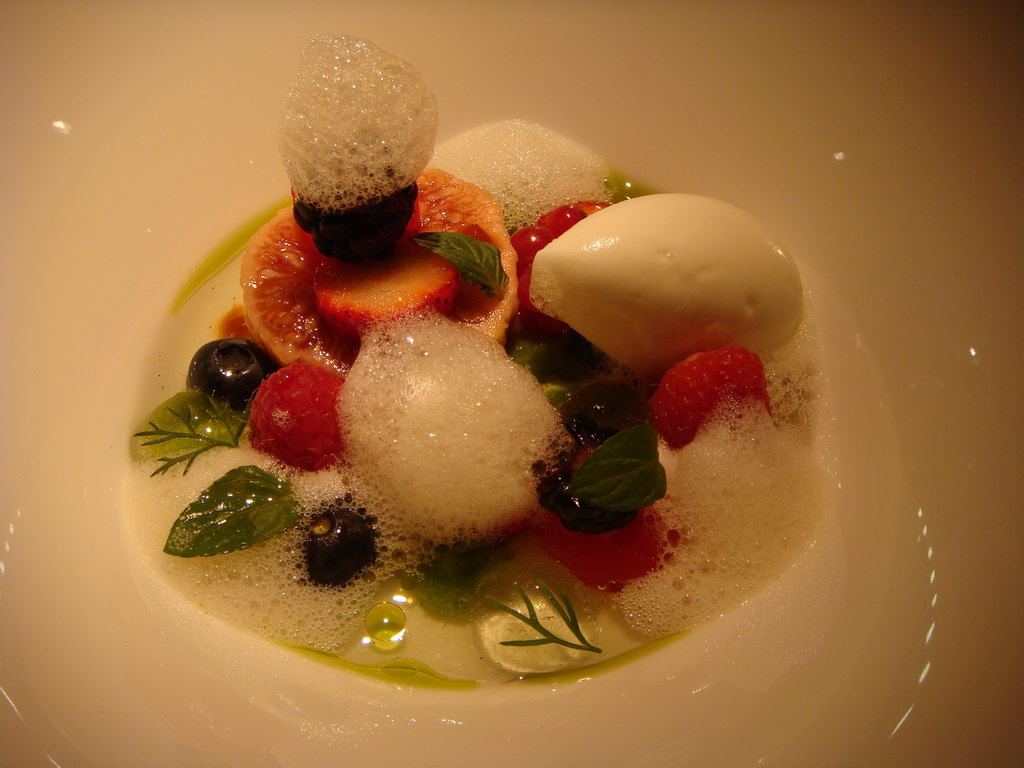 真正的甜是「七彩果球佐法式白乳酪冰沙(Les Fruits perles de jus sur un coulis épicé, kaki confit et sorbet au formage blanc)」,花果、小莓、莓、覆盆子、草莓成的多彩水果,一球白乳酪冰沙微酸度,合得好,汁不甜、薄荷和味。半透明的是水果果汁,用水包在透明球,非常漂亮,也是的分子料理技。