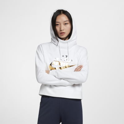 Nike Sportswear Rally 女款金屬色連帽上衣,結合經典標誌圖案與現代金屬感元素。混搭 Nike 兩款最經典標誌線條,結合 1971 原創設計與當代 Nike 標誌。