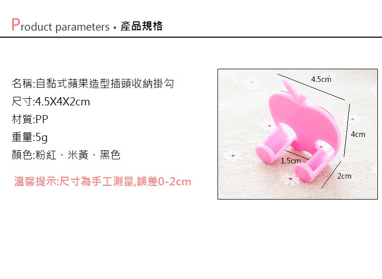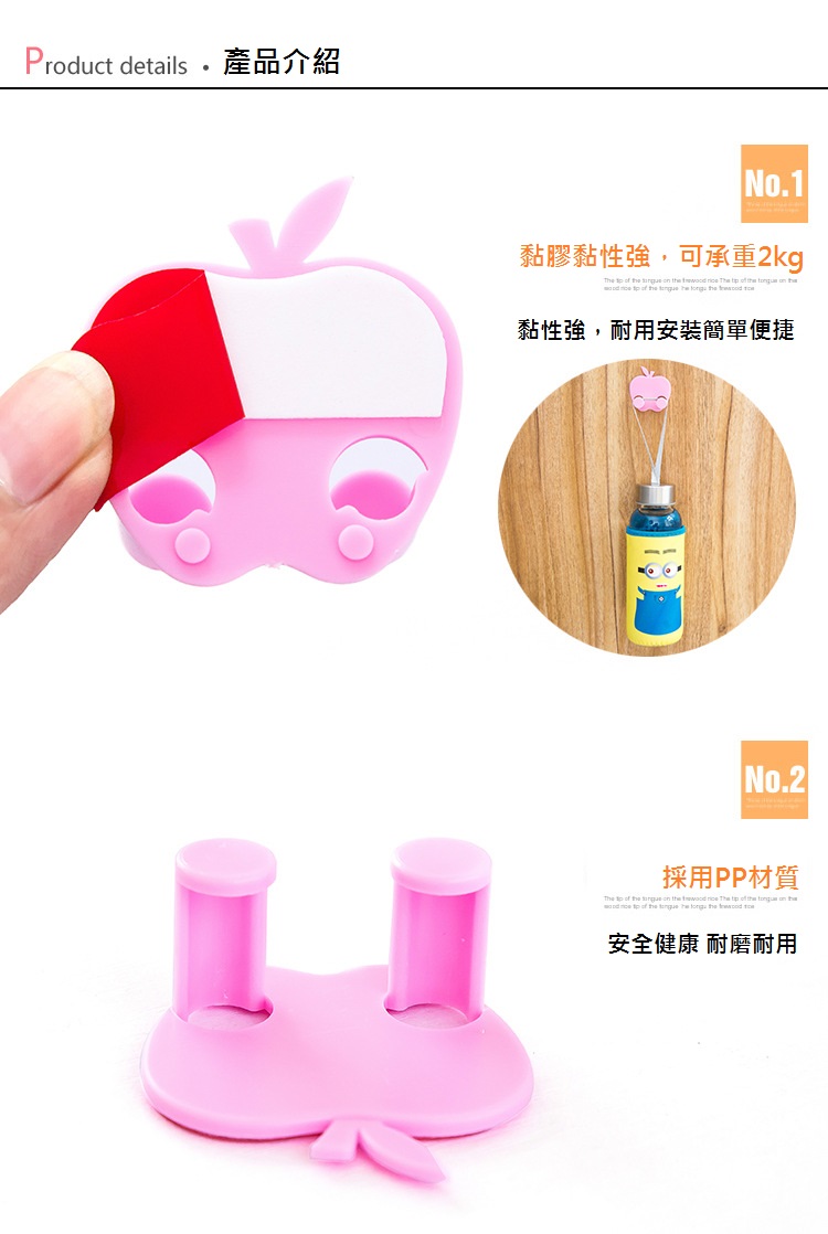 自黏式果造型收勾,用PP材,安全健康、耐用耐磨。背黏性,可承重2KG,安便捷。