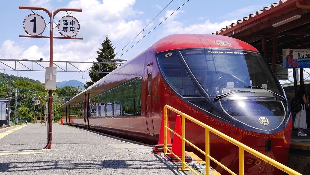 一下子就到河口湖站,旁就停了一台今年4月3日行的「富士山ビュ特急」,原本也有考要搭班列,但上和算上都法配合只好下次有再啦,可以先近距看到就很心了!