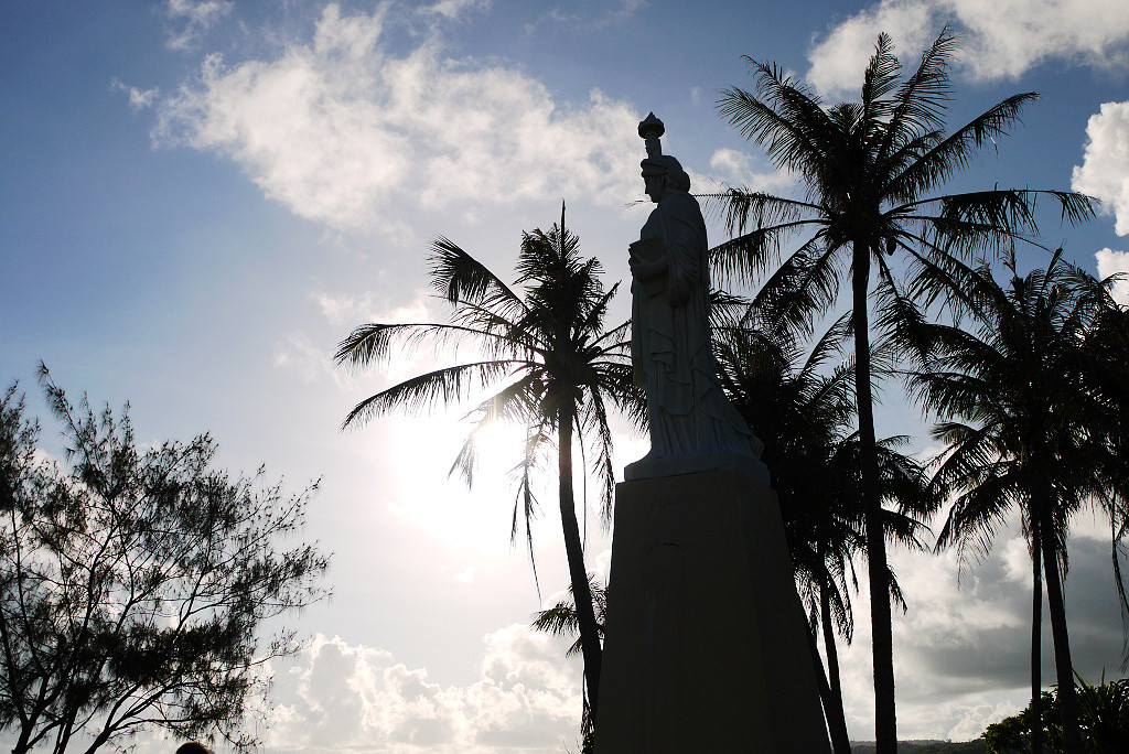 眼前看的就是成排的椰子、有那在晨曦中著金色光的雕像