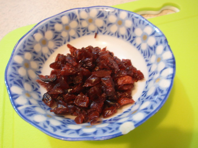 放到乾的菜板上放上各料一 , 蟹, 仁, 肉, 蔓越莓乾2~3