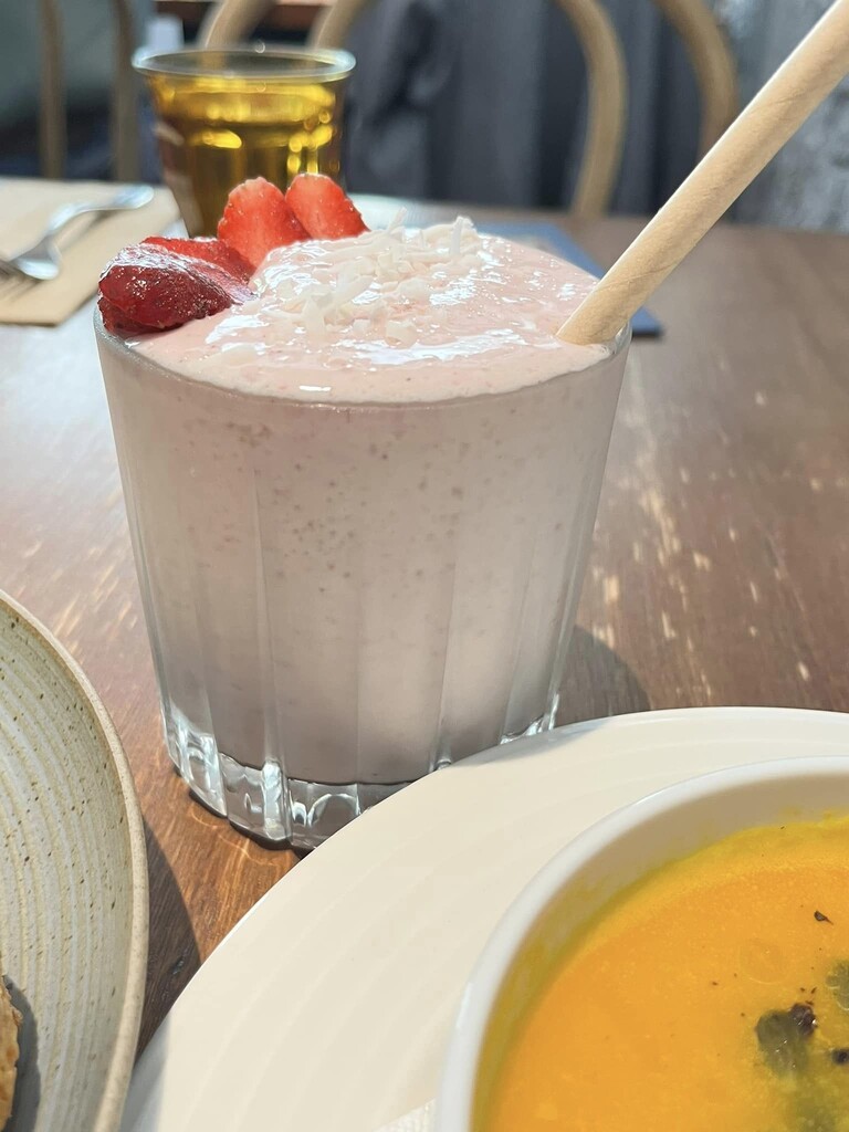 慕名前往+好朋友家。我了咖啡奶油司康早餐+舒肥胸肉。奇果草莓果昔。南瓜。她了火果早餐。