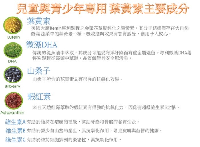 - ◎美Kemin大FloraGLO利素及利微藻DHA, 搭配山桑子及素, 可提供多重防, 共同守晶亮世界