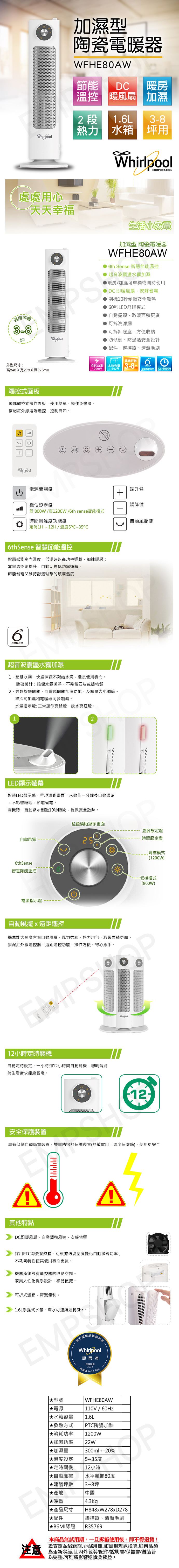 【Whirlpool惠而浦】加型PTC陶瓷暖器 WFHE80AW ,推,箱,CP值,,,便宜,惠,介,排行,精,特,周年,,限