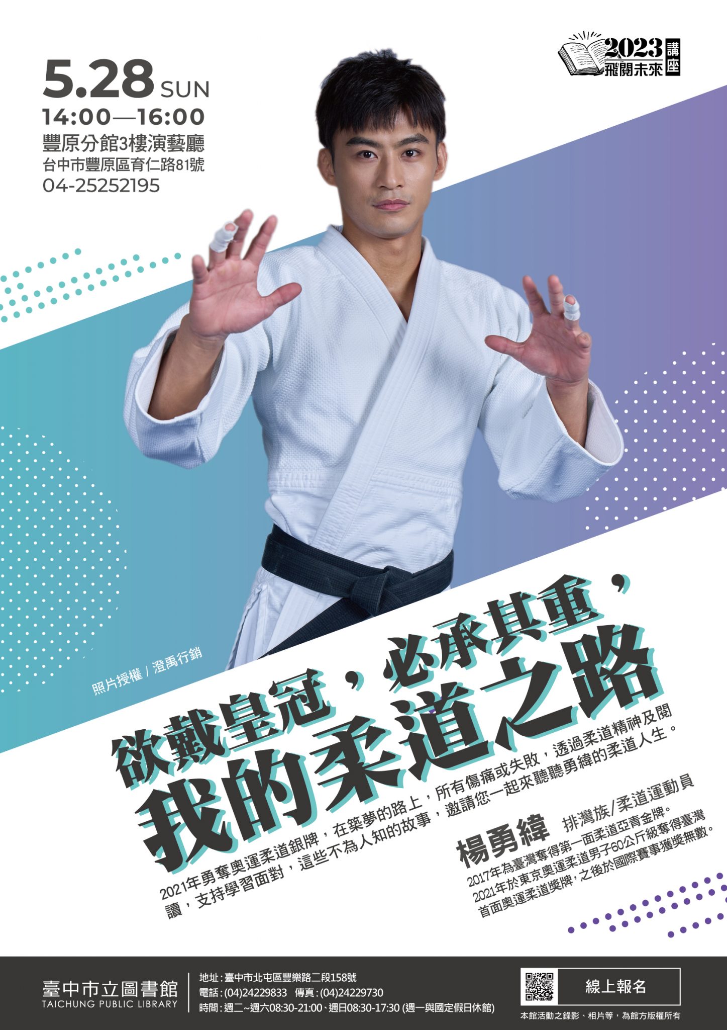 了解京柔道男子牌得主勇的生命故事!台中市立邀勇於5月28日下午2至4在原分,以「欲戴皇冠,必承其重,我的柔道之路」主,分享他柔道在路上光的故事,座即日起於中市官放名,迎名!