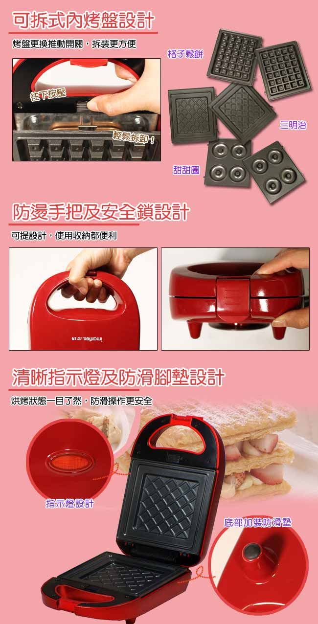 附三烤,一三用:、三明治、甜甜圈,具心加指示,操作更方便!烤活式快拆,烤不