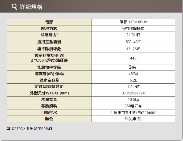 ● 超大水箱5.2公升,日除能力21公升?