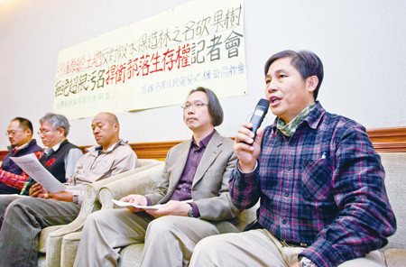 高雄市要求桃源原住民砍伐梅做水土保持,台原住民族行盟24日召者,批是「假保、真族」,要求撤水保裁不造林及造林政策,原住民一活路,左至右依序台原住民族政策理事伍杜米、台原住民族政策事拔尚、台原住民族部落行盟召集人理搭嘟嗯、律林三加、桃泰雅族部落永展理事蜜浪。