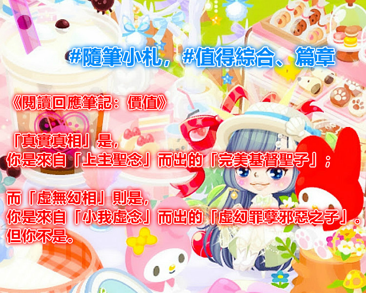 【小札】《回:值》「真真相」是,你是自「上主念」而出的「完美基督子」;而「幻相」是,你是自「小我念」而出的「幻罪孽邪之子」。但你不是。
