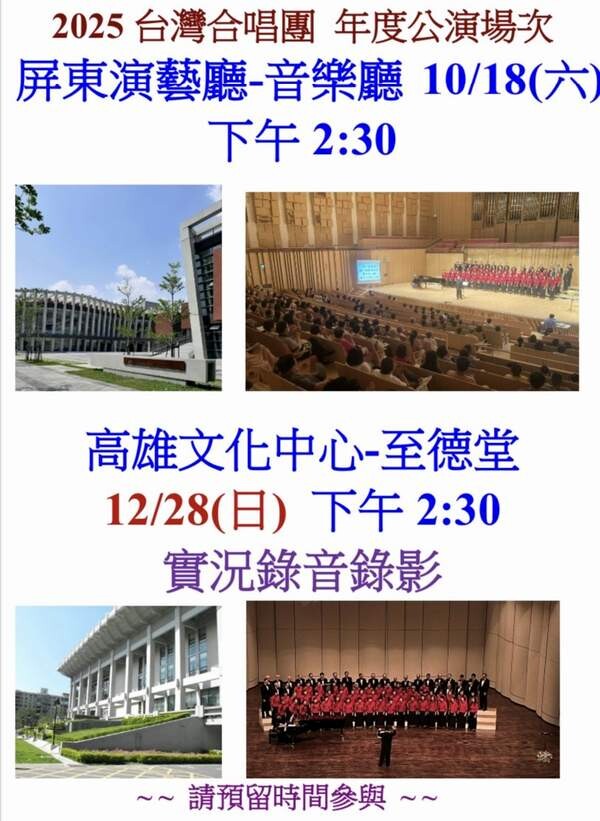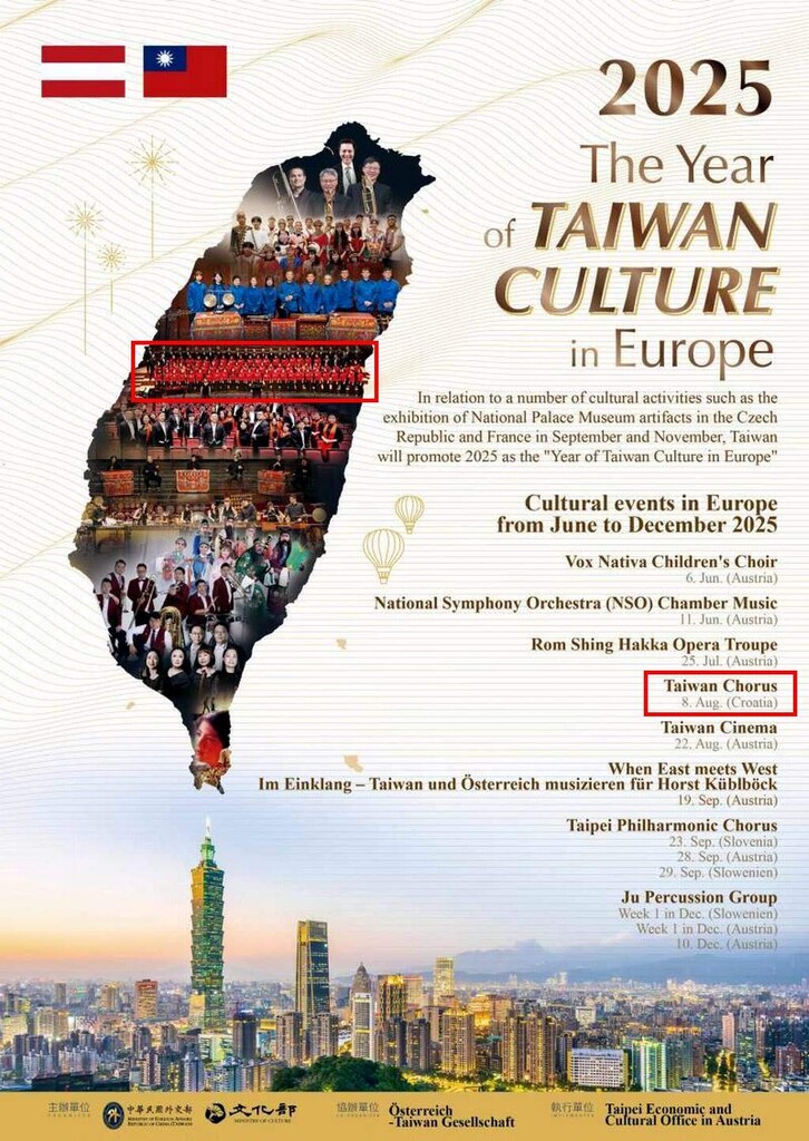 1.海外演唱:克埃西-札格雷布(Croatia Zagreb) :2025年08月08日(五) 20:00 地: 路德布雷格文化中心(位首都札格雷布北方近郊) (Centre for Cultural and Information in Ludbreg) 免入 文化外交2部力挺故 「洲台文化年」6 至12月登 https://art.ltn.com.tw/article/breakingnews/5039786  【文化】 地利代表推2025洲台文化年 6月起及3 https://art.ltn.com.tw/article/paper/1706345 海文字中 2025洲台文化年 8月8日 克埃西 :20:00 地:路德布雷格文化中心 演出:台合唱 主位:中民 外交部 文化部 位:地利台 客家委 行位:地利台北文化代表 演出地及片: 英文:Centre for Cultural and Information in Ludbreg 中文:路德布雷格文化中心(位首都札格雷布北方近郊) 克文:CENTAR ZA KULTURU I INFORMIRANJE DRAGUTIN NOVAK. LUDBREG Trg Sv. Trojstva 19, CROATIA 中文:德拉古廷瓦克文化中心,路德布雷格 三一19,克埃西 演出地站息: Koncert Tajvanskog zbora(台合唱演唱) https://czkidn.hr/events/koncert-tajvanskog-zbora/   |