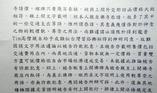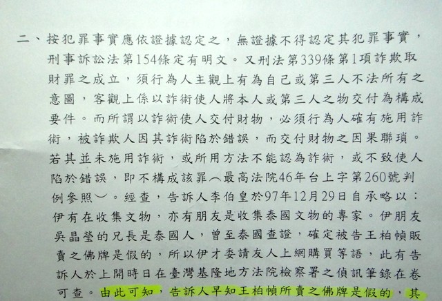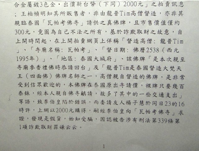 本案明佛寺及寺佛牌店所售同款佛牌真,泰友人RONGROAD POOTHONG先生真品及品佛牌於2008年11月23日加泰曼谷春普里-嘎帕淡化佛牌比,佛寺1500泰到的真品得到第3名(九),但寺佛牌店所售的品被佛牌拒收退件,退件原因佛牌明是後期新做的,不是佛寺2538年(西元1995年)所作限量span lang="EN-US">1的真品,以此之佛寺的佛牌店所售的佛牌已定不是佛寺2538年(西元1995年)作量1的真品,合以上,被告涉嫌欺至明。