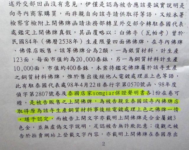 六、告人之泰友人RONGROAD POOTHONG先生(中文音姓名:路通,泰住址:NOoo SOI KUNTABUT SUKUMVIT SAMATPRAKRAN 泰002-66-8-7593oooo )2008年8月2日至佛寺「」查被告售的3色金佛牌,佛寺「」有售2538的牌或3色金佛牌(八),拜佛寺的弟子(工作人),先後到2寺方2538(西元1995年)作量1的色「真品」,一要1500泰,後在佛殿外的佛牌店(即所的寺佛牌店)找到「品」佛牌,其中一家商常看到泰友人RONGROAD POOTHONG先生常常到佛寺供真品及捐款,好意告他,是光客的,於「品」,他不要,要真品要去佛寺…。由此可知原告委查的泰友人、被告及外交部查人佛寺已得有同款高的「真品」售,委佛寺代真品的格要1500泰,品是在寺「」佛牌店(非佛寺)入,且三人分到200~300~400~500泰格不等的同款「品」。
