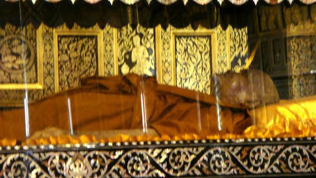 佛寺弟子於移玻璃棺前.