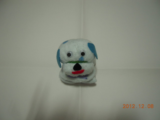 18、最後用小塑袋好毛巾狗,在著。【些文具店都有】。