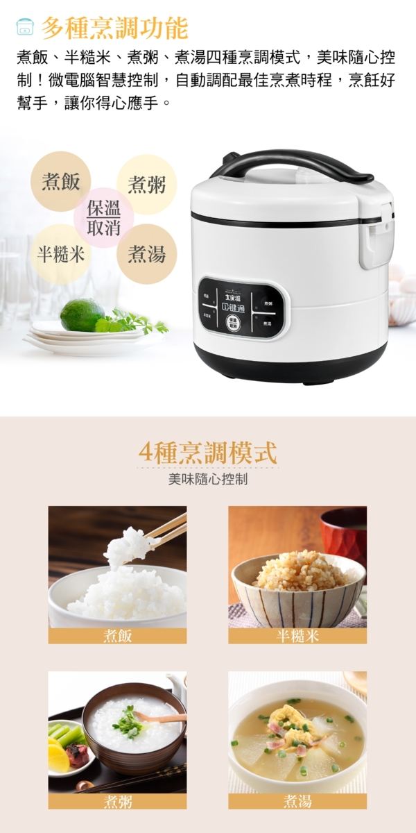 多烹功能,煮、半糙米、煮粥、煮、保/取消。